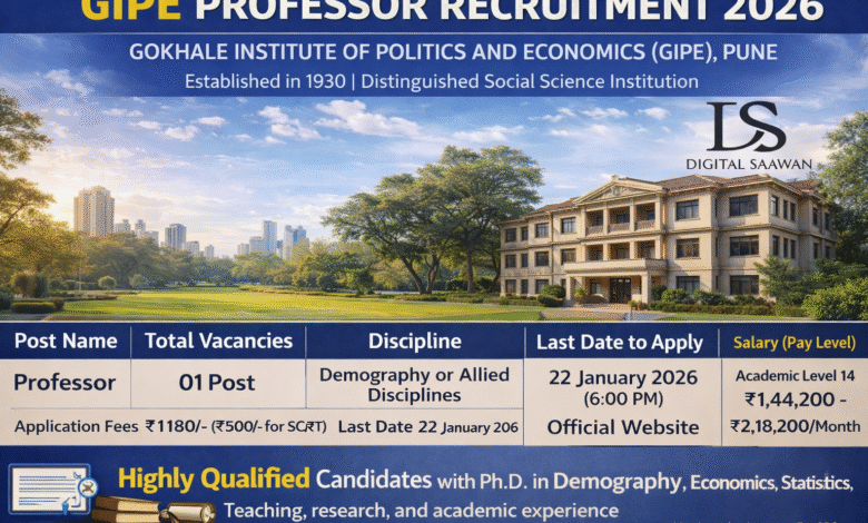 According to available data, the Gokhale Institute of Politics and Economics (GIPE) has released an official notification for Professor recruitment 2026. This hiring process is being conducted to fill one regular faculty position in Demography or allied disciplines at its Pune campus.